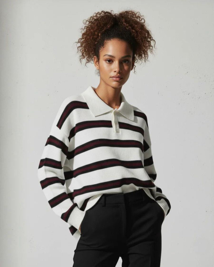 A nod to classic collegiate style, the Varsity Stripe Knit Polo Sweater brings effortless cool with a vintage-inspired twist. Designed with bold horizontal stripes and a relaxed fit, this cozy pullover pairs timeless comfort with modern edge. The collared neckline and button placket add a preppy finish, making it the perfect piece for layering or casual styling all season long.